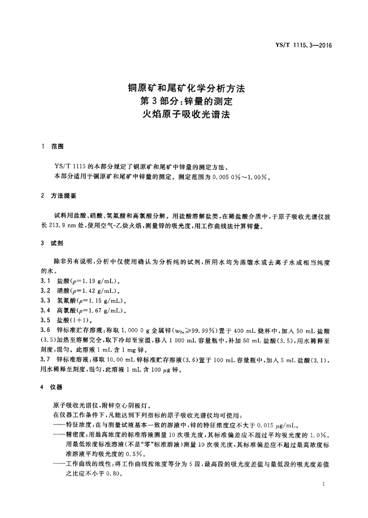 YS/T 1115.3-2016 铜原矿和尾矿化学分析方法 第3部分:锌量的测定火焰原子吸收光谱法
