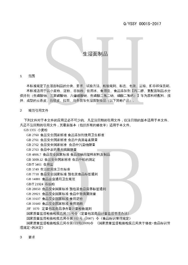 Q/YSSY 0001S-2017 生湿面制品