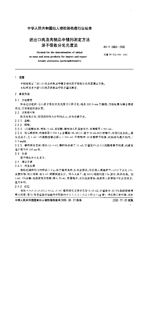 SN/T 0863-2000 进出口肉及肉制品中镍的测定方法 原子吸收分光光度法
