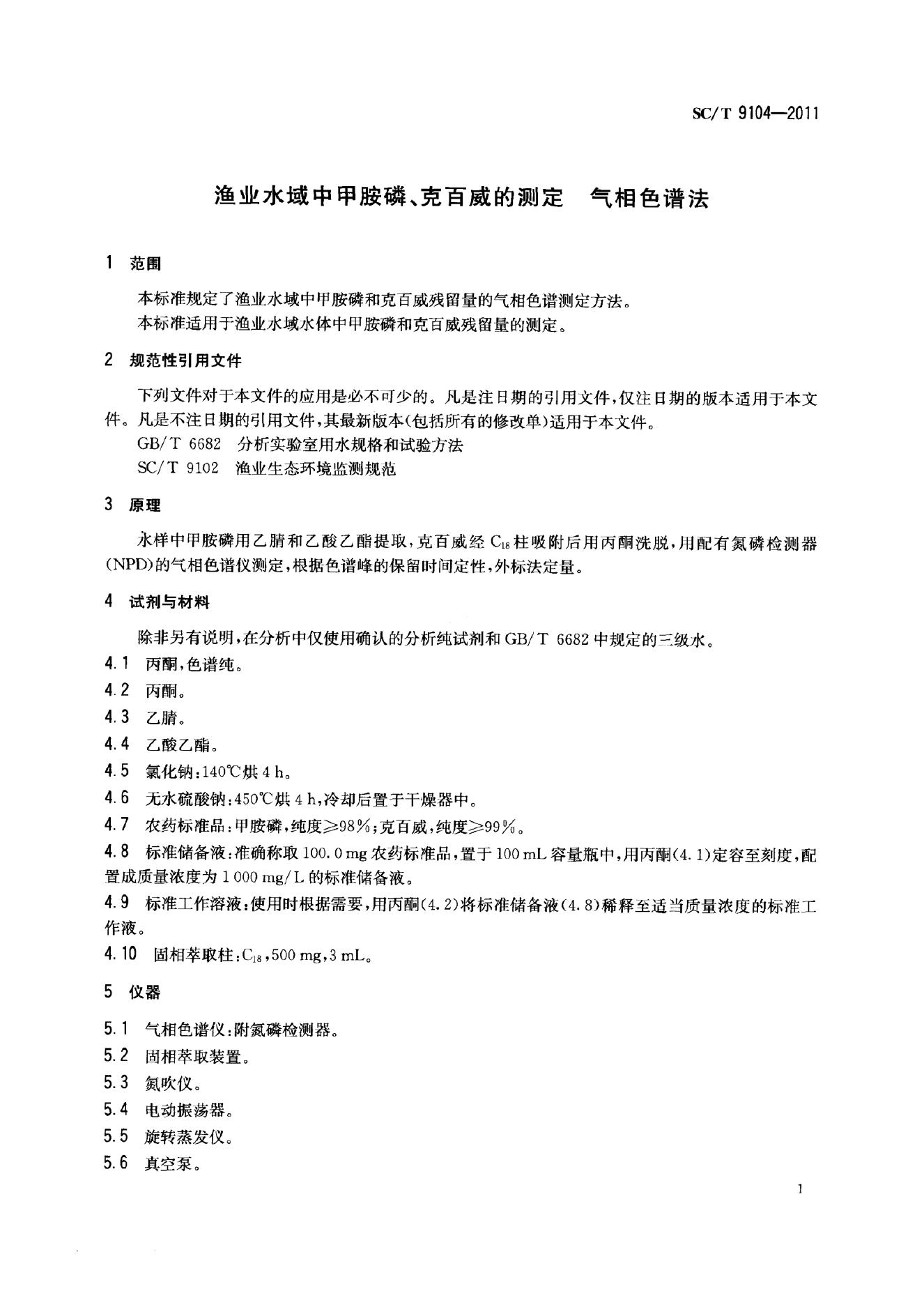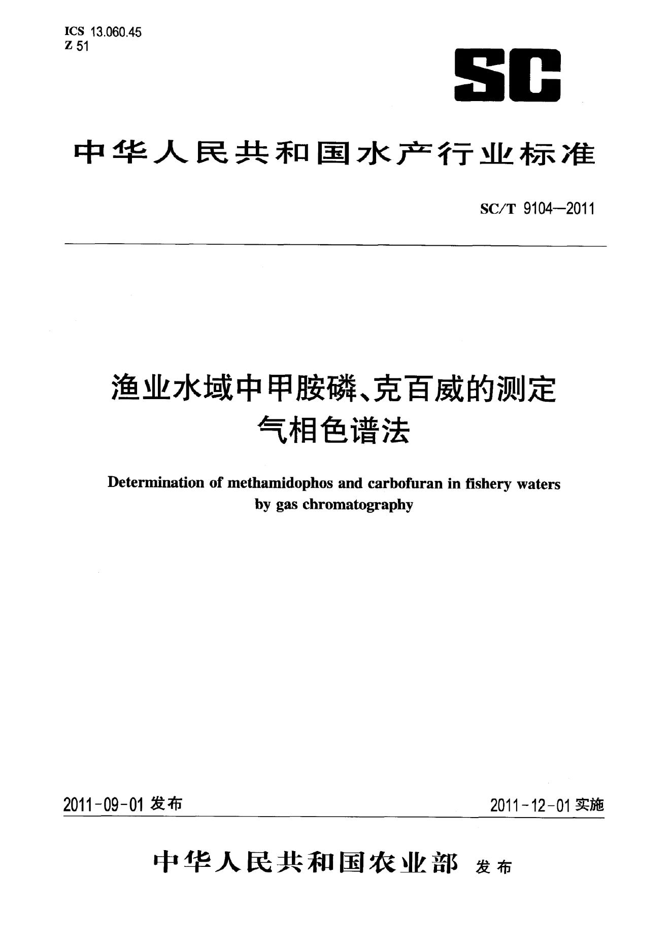 SC/T 9104-2011 渔业水域中甲胺磷、克百威的测定 气相色谱法