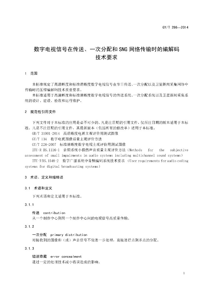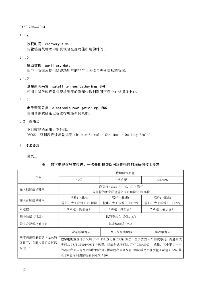GY/T 286-2014 数字电视信号在传送、一次分配和SNG网络传输时的编解码技术要求