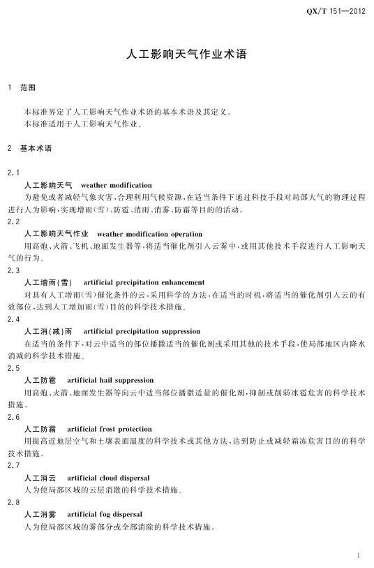 QX/T 151-2012 人工影响天气作业术语