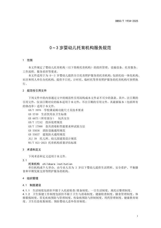 DB50/T 1934-2025 0-3岁婴幼儿托育机构服务规范