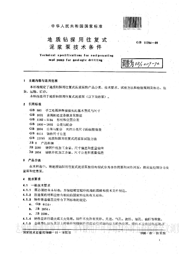 DZ/T 0119-1994 地质钻探用往复式泥浆泵技术条件