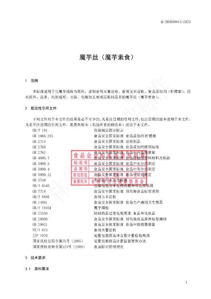 Q/JHSK 0001S-2022 魔芋丝(魔芋素食)