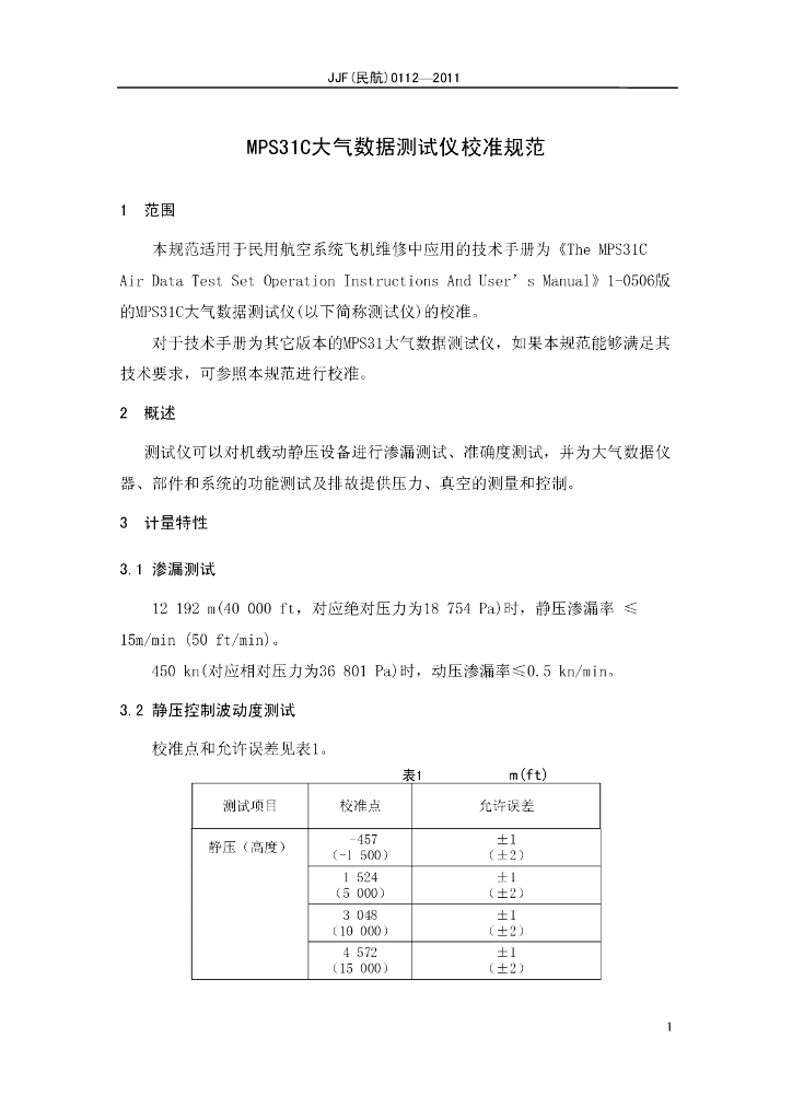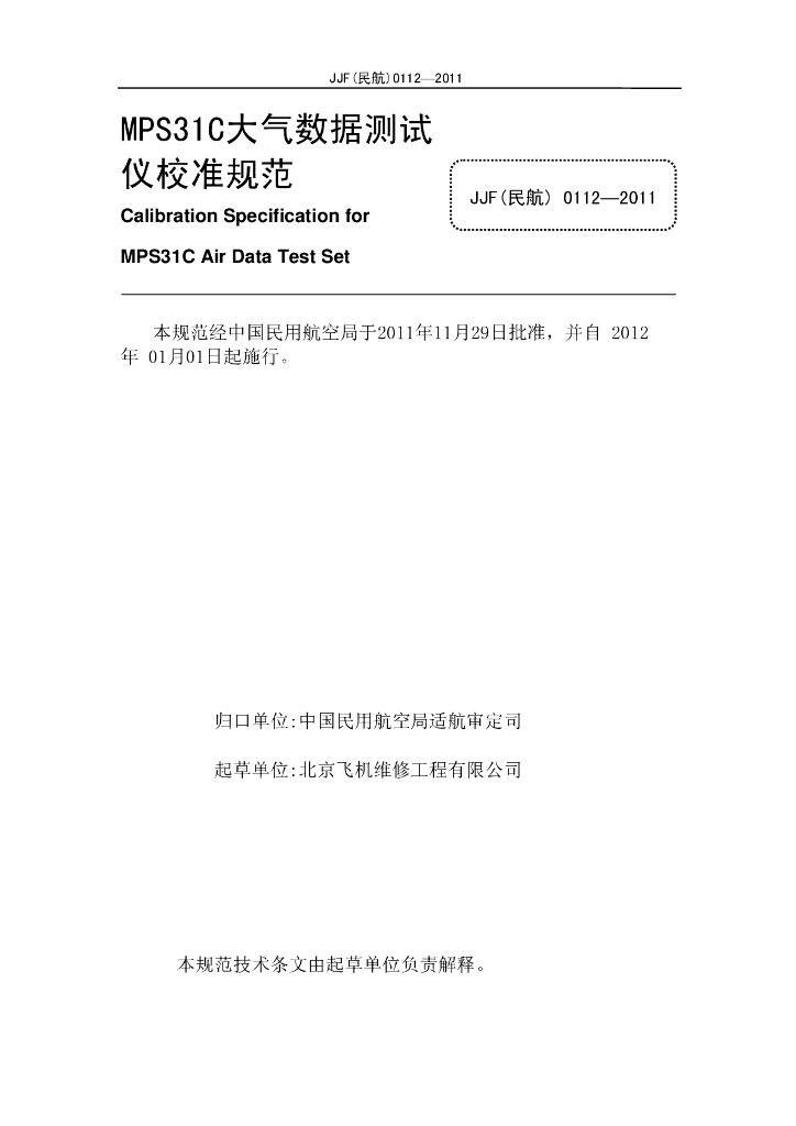 JJF(民航)0112-2011 MPS31C大气数据测试仪