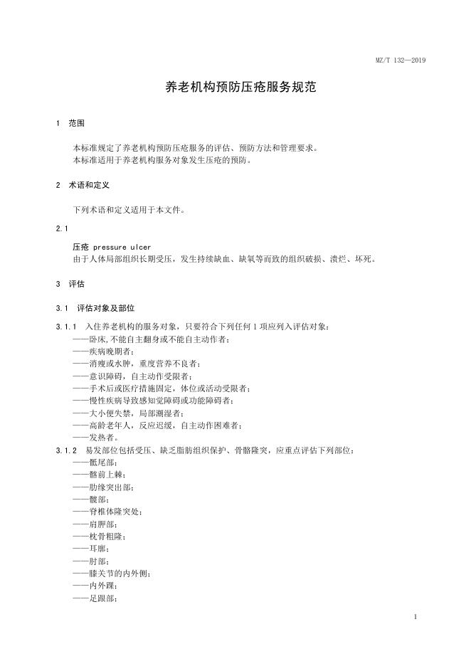 MZ/T 132-2019 养老机构预防压疮服务规范