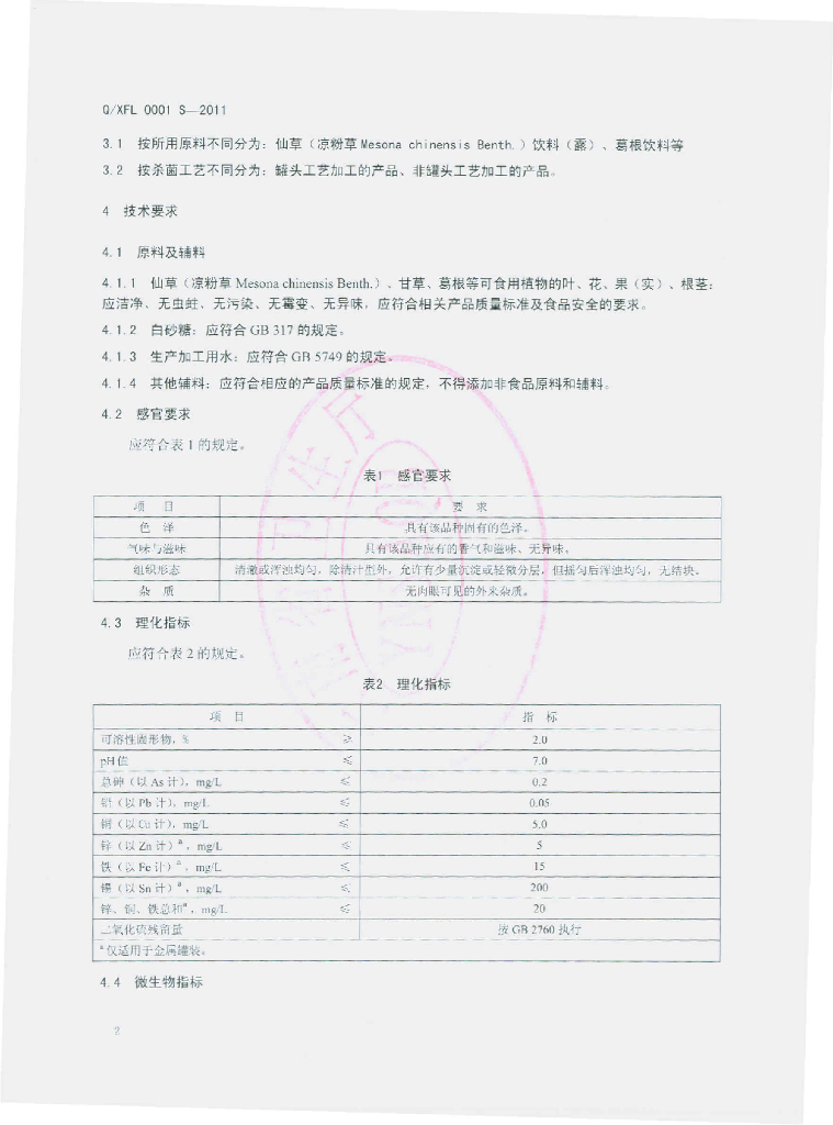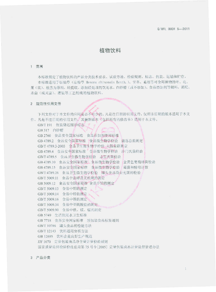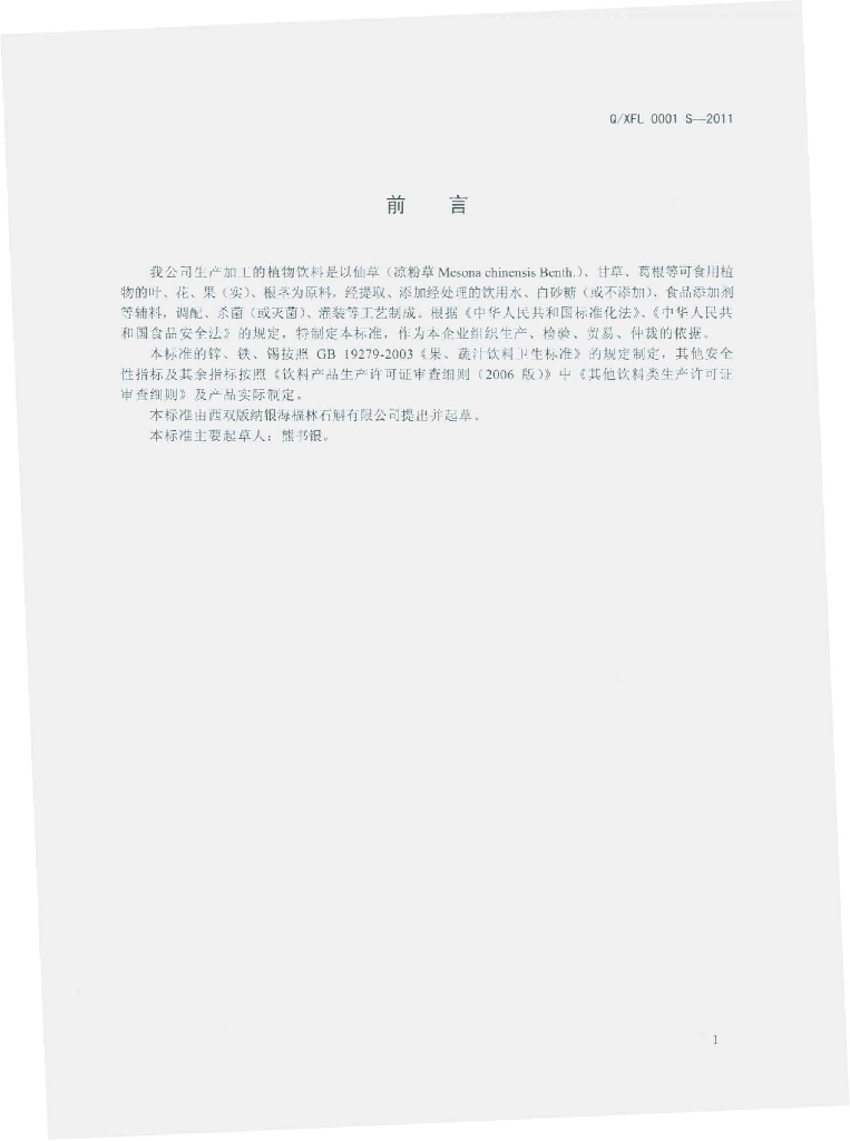 Q/XFL 0001S-2011 植物饮料
