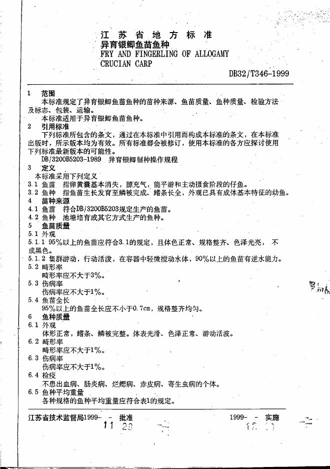 DB32/T 346-1999 异育银鲫鱼苗鱼种