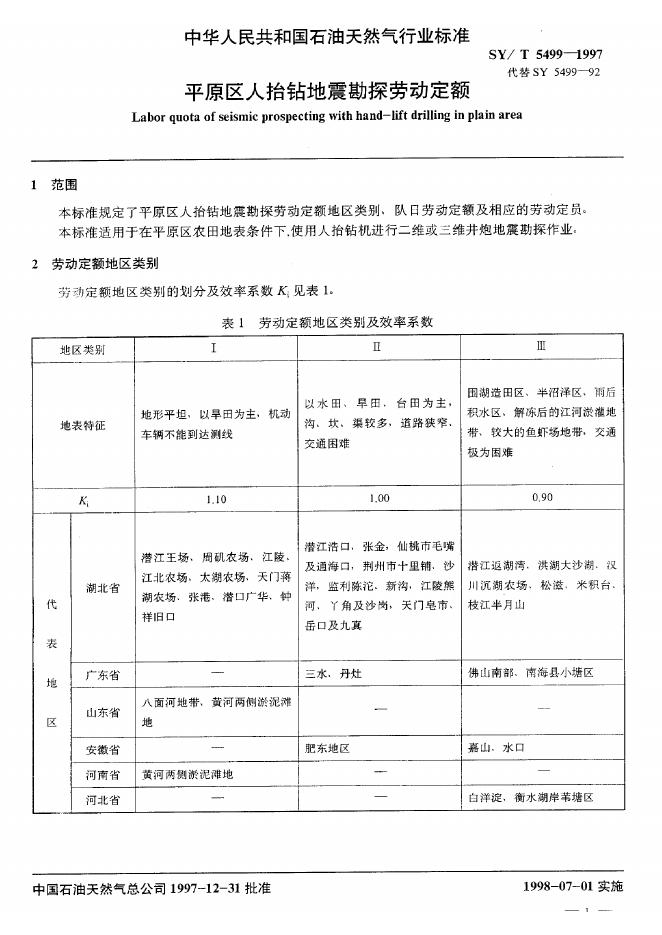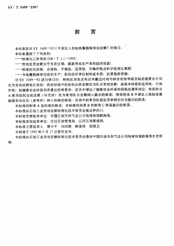 SY 5499-1992 平原区人抬钻地震勘探劳动定额