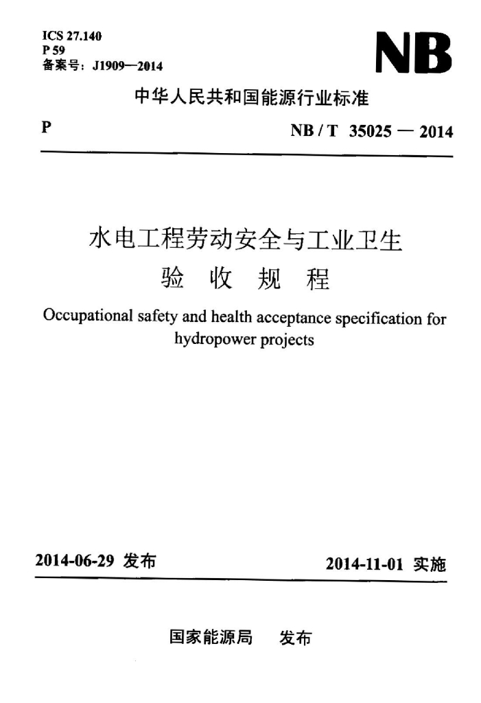 NB/T 35025-2014 水电工程劳动安全与工业卫生验收规程