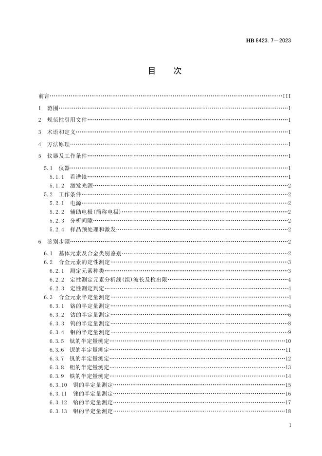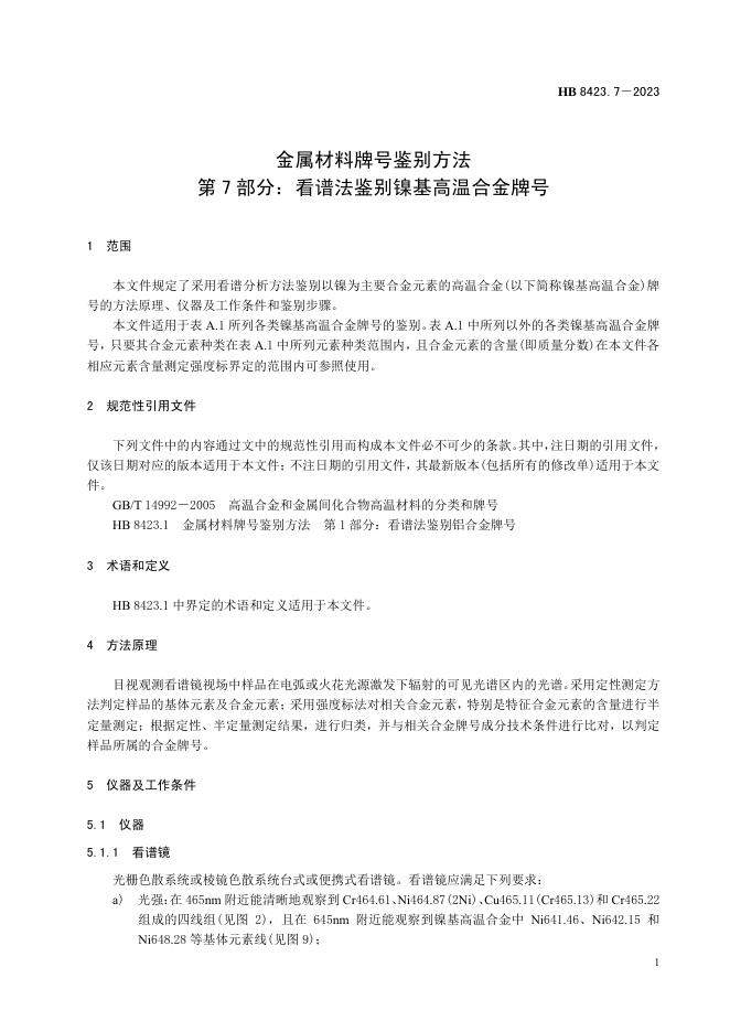 HB 8423.7-2023 金属材料牌号鉴别方法 第7部分:看谱法鉴别镍基高温合金牌号