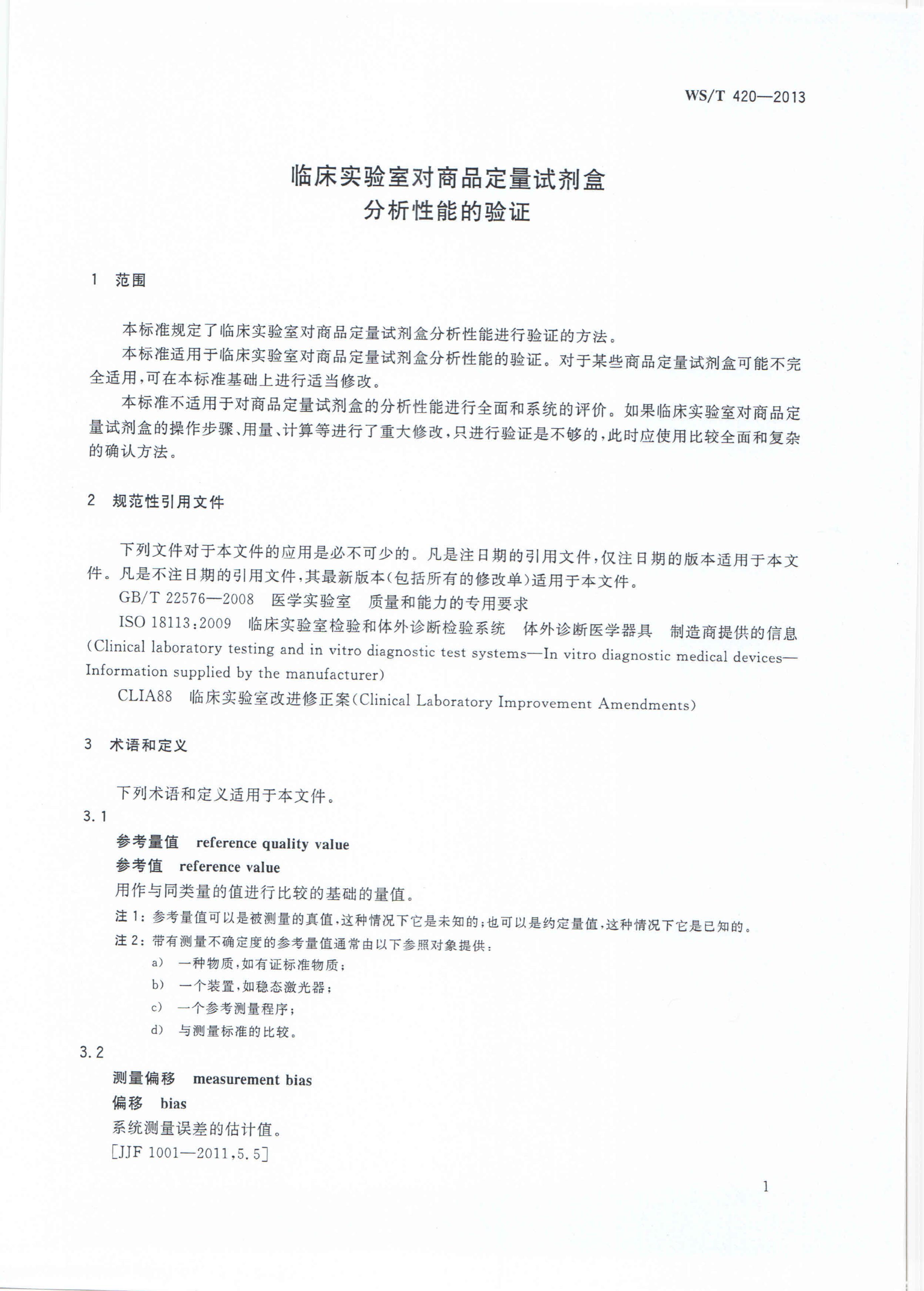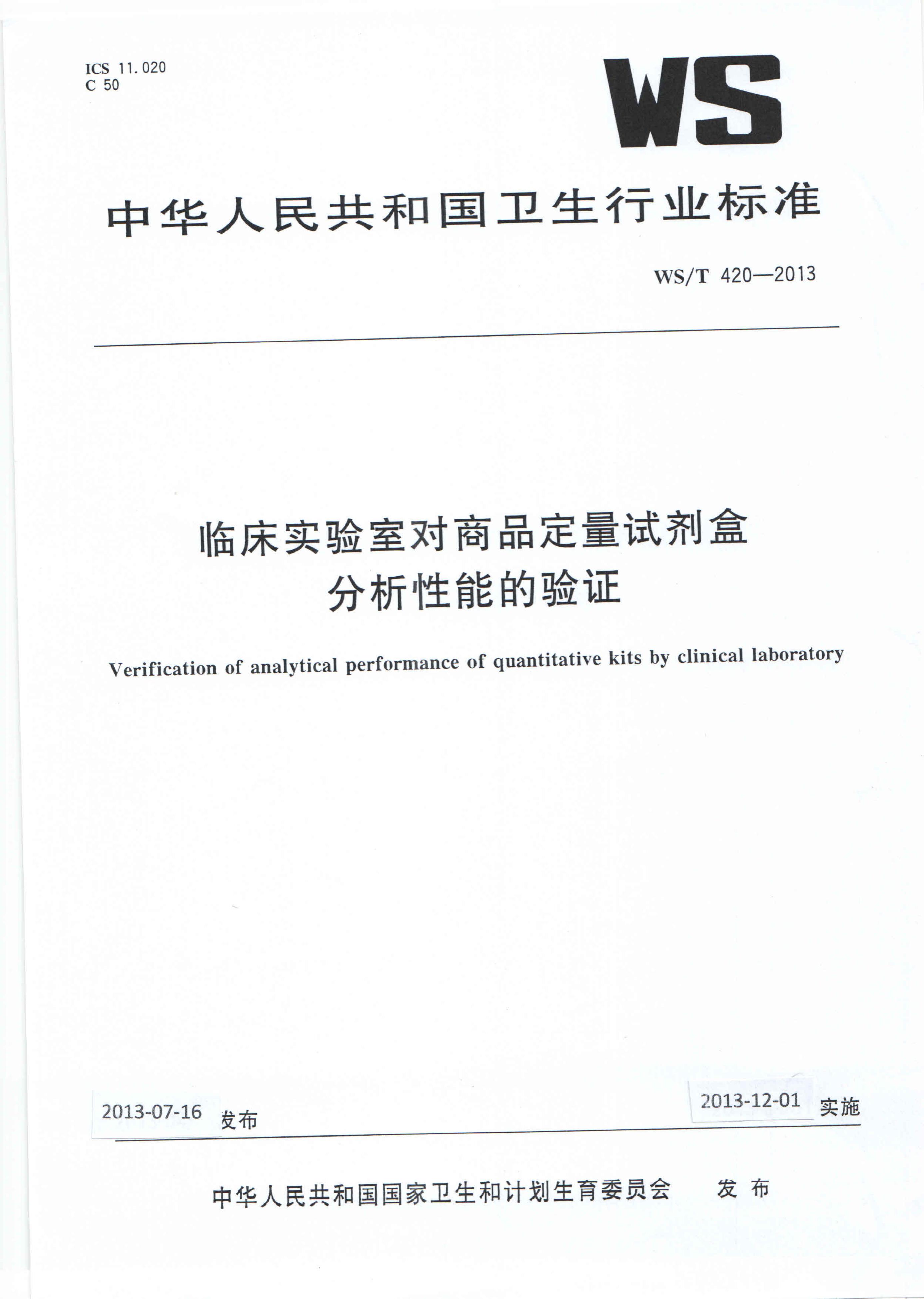 WS/T 420-2013 临床实验室对商品定量试剂盒分析性能的验证