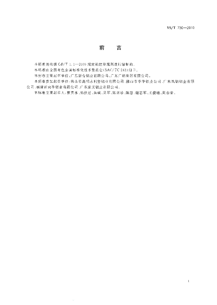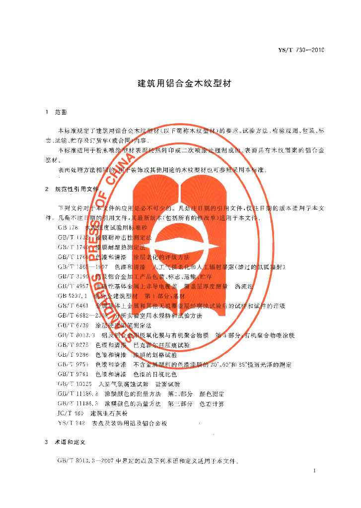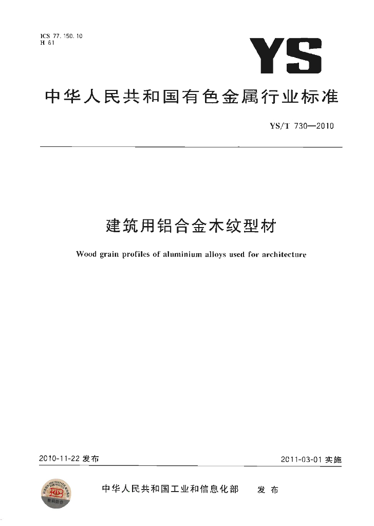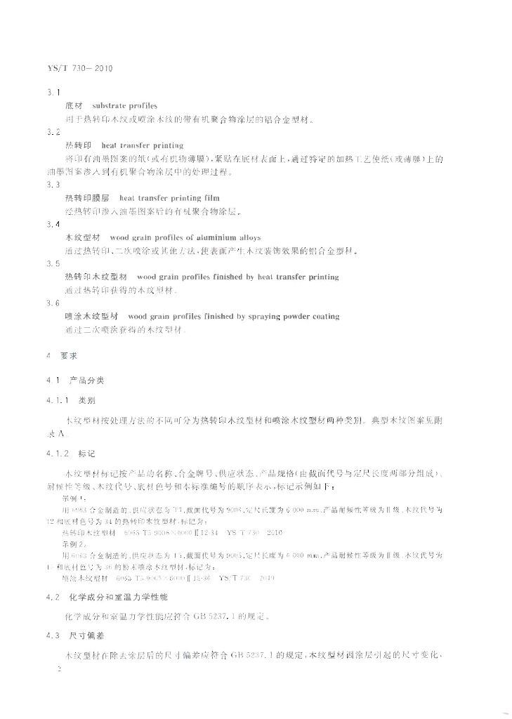 YS/T 730-2010 建筑用铝合金木纹型材