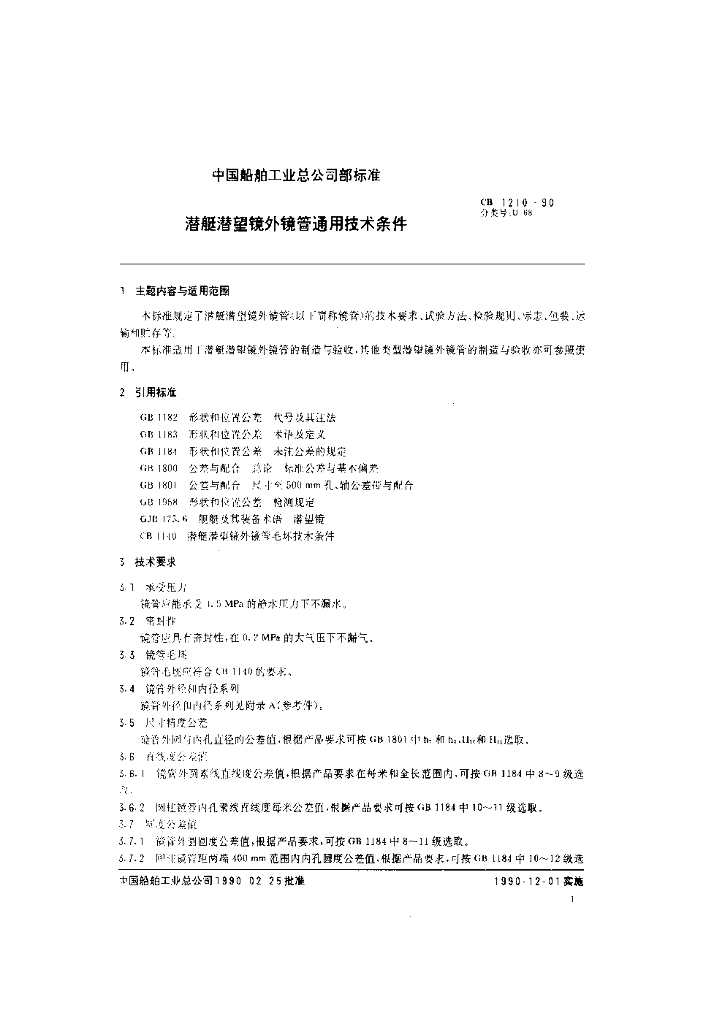 CB 1210-1990 潜艇潜望镜外镜管通用技术条件