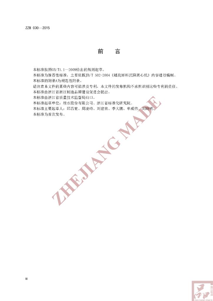 本标准起草单位:绿水股份有限公司、浙江省标准化研究院。