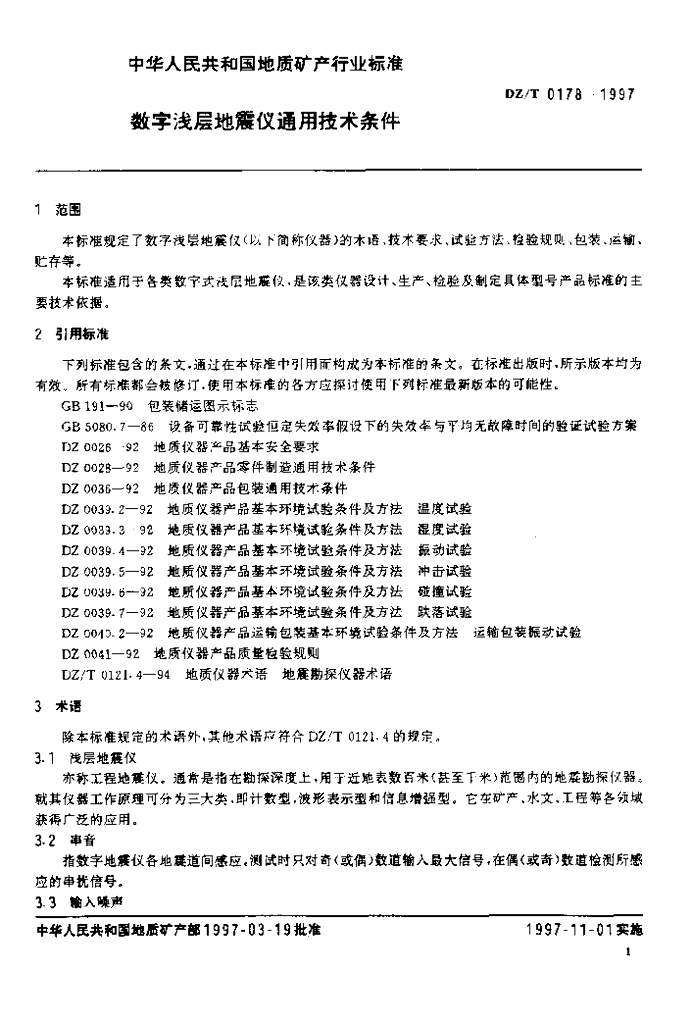 DZ/T 0178-1997 数字浅层地震仪通用技术条件