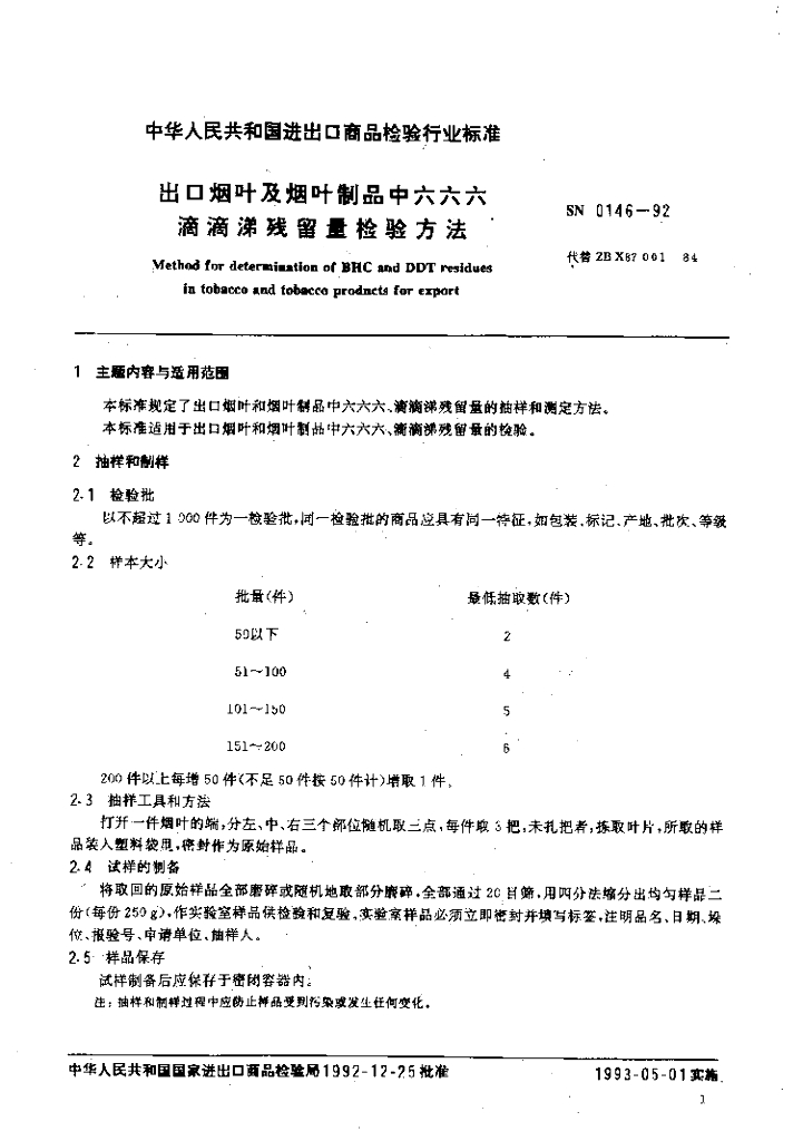 SN 0146-1992 出口烟叶及烟叶制品中六六六,滴滴涕残留量检验方法