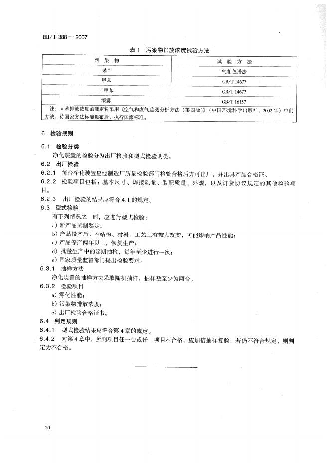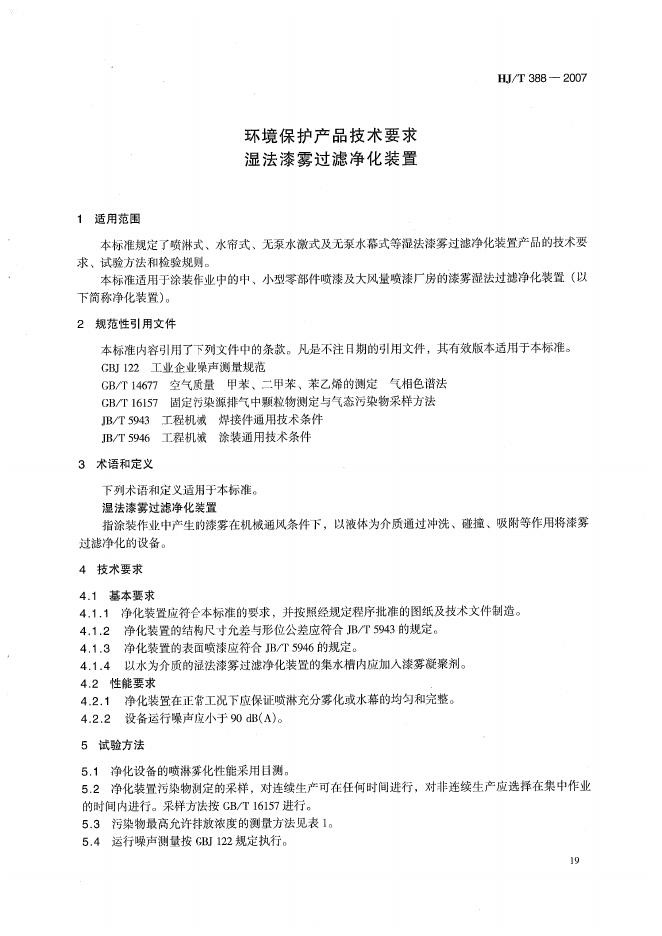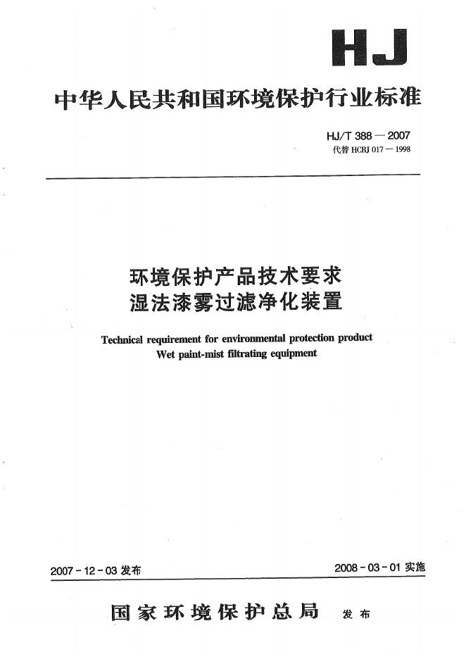 HJ/T 388-2007 环境保护产品技术要求 湿法漆雾过滤净化装置