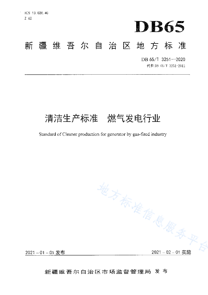 DB65/T 3251-2020 清洁生产标准 燃气发电行业