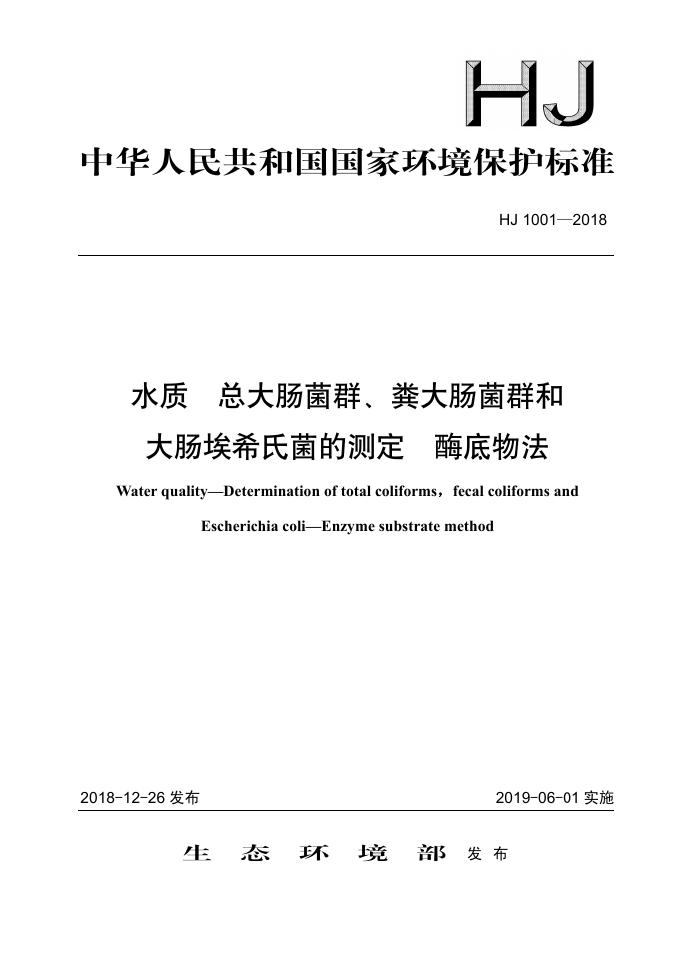 HJ 1001-2018 水质 总大肠菌群的测定 、粪大肠菌群和大肠埃希氏菌的测定 酶底物法