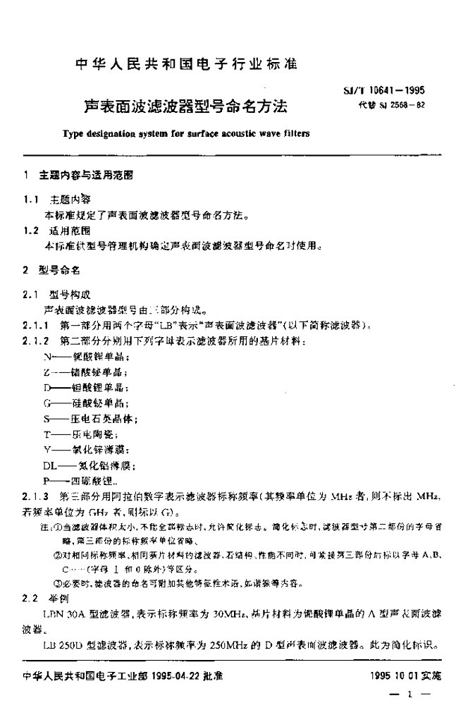 SJ/T 10641-1995 声表面波滤波器型号命名方法