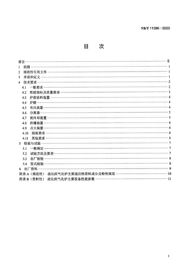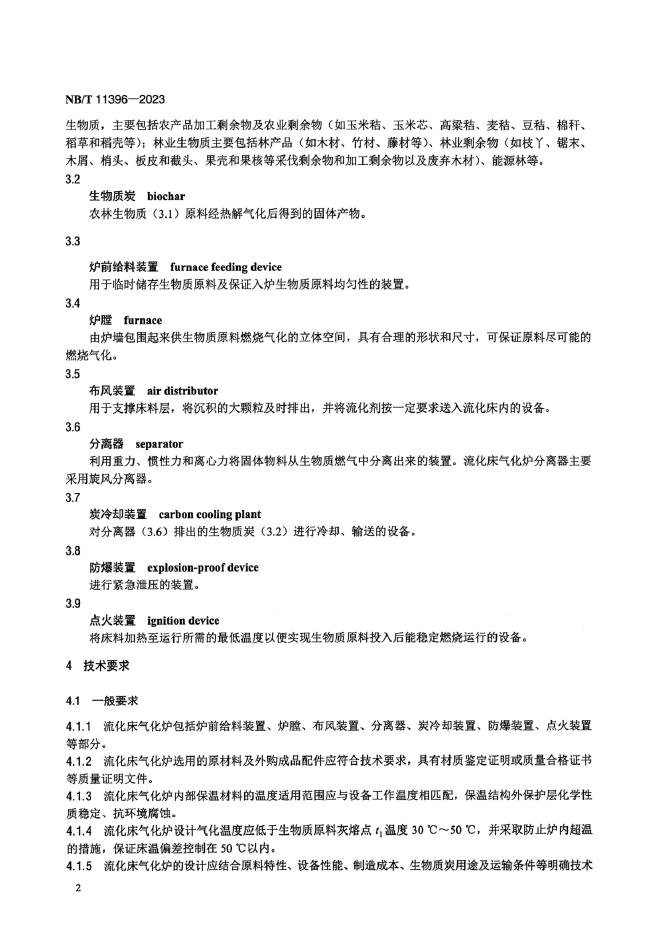 NB/T 11396-2023 生物质气化多联产流化床气化炉技术条件