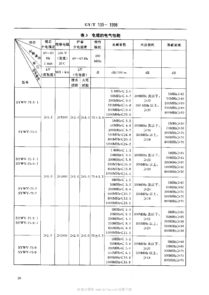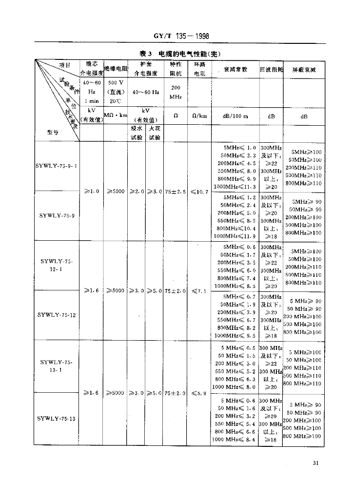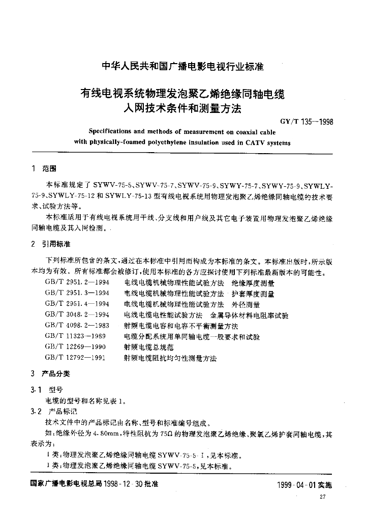 GY/T 135-1998 有线电视系统物理发泡聚乙烯绝缘同轴电缆人网技术条件和测量方法