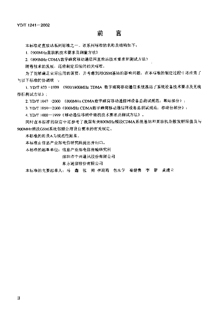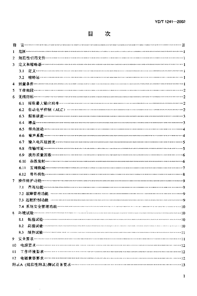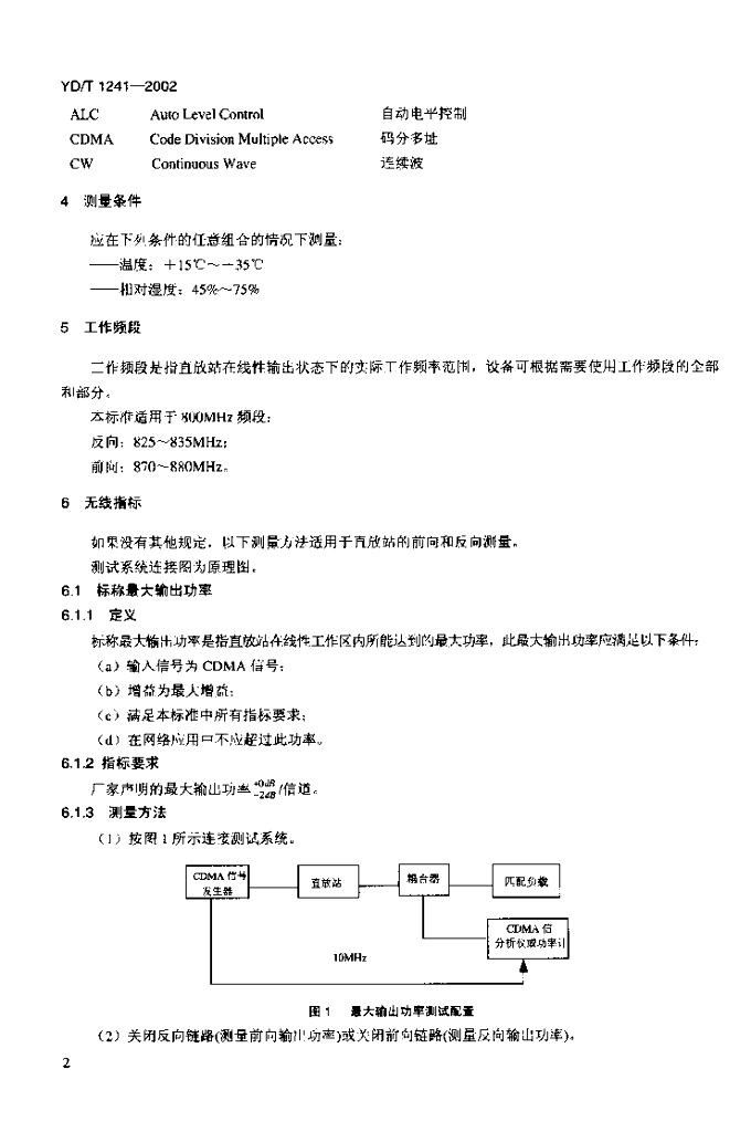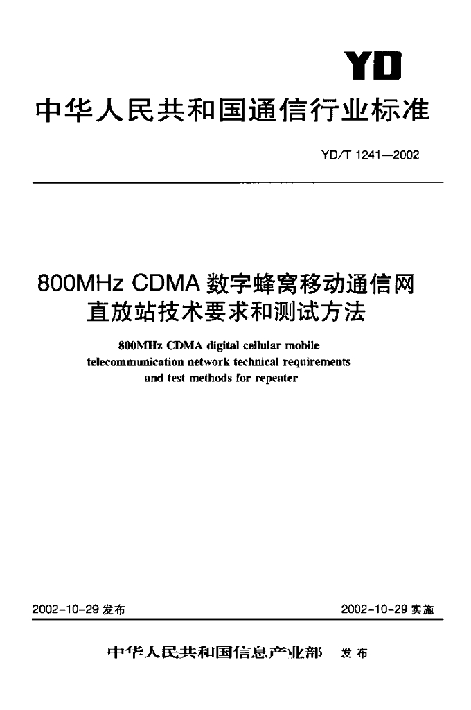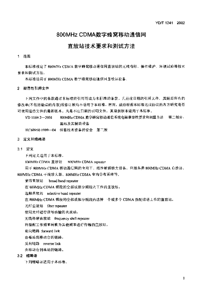 YD/T 1241-2002 800MHz CDMA 数字蜂窝移动通信网直放站技术要求和测试方法