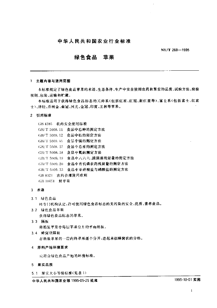NY/T 268-1995 绿色食品 苹果
