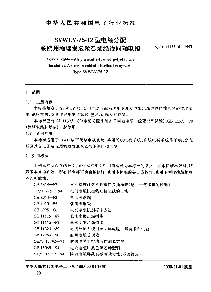 SJ/T 11138.4-1997 电缆分配系统用物理发泡聚乙烯绝缘同轴电缆