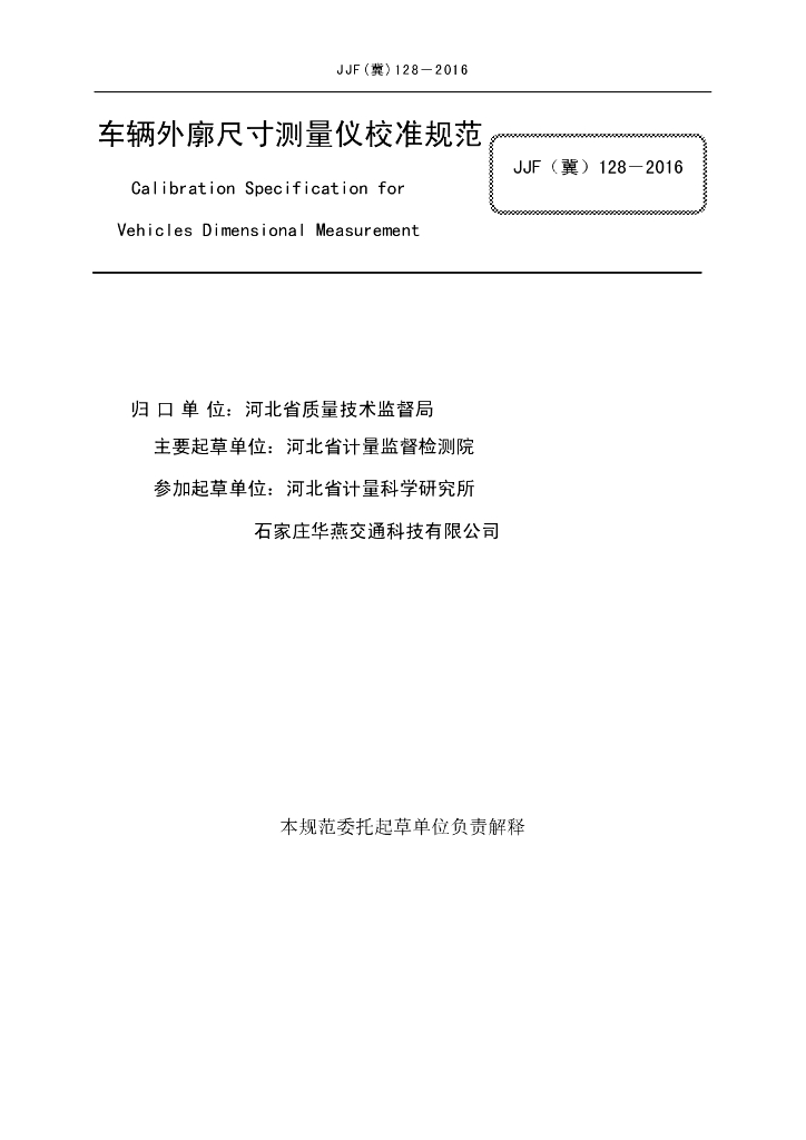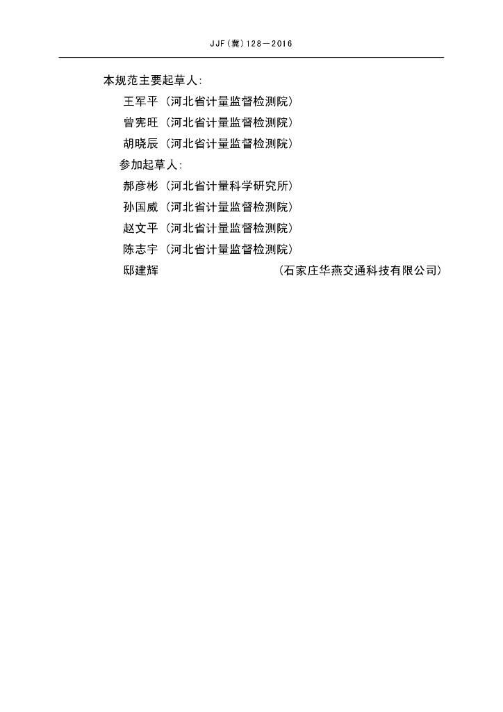 王军平(河北省计量监督检测院)、曾宪旺(河北省计量监督检测院)、胡晓辰(河北省计量监督检测院)、郝彦彬(河北省计量科学研究所)、孙国威(河北省计量监督检测院)、赵文平(河北省计量监督检测院)、陈志宇(河北省计量监督检测院)、邸建辉(石家庄华燕交通科技有限公司)