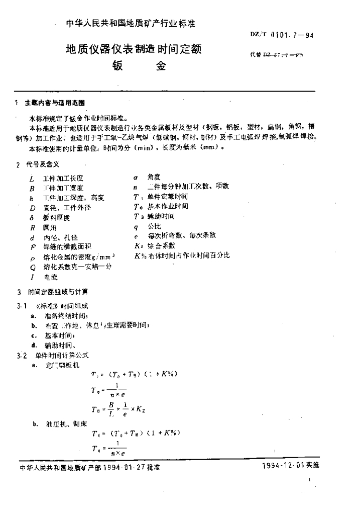 DZ/T 0101.7-1994 地质仪器仪表制造时间定额钣金