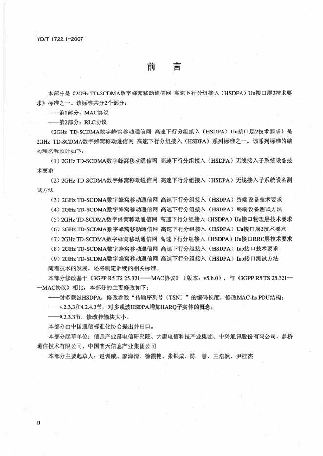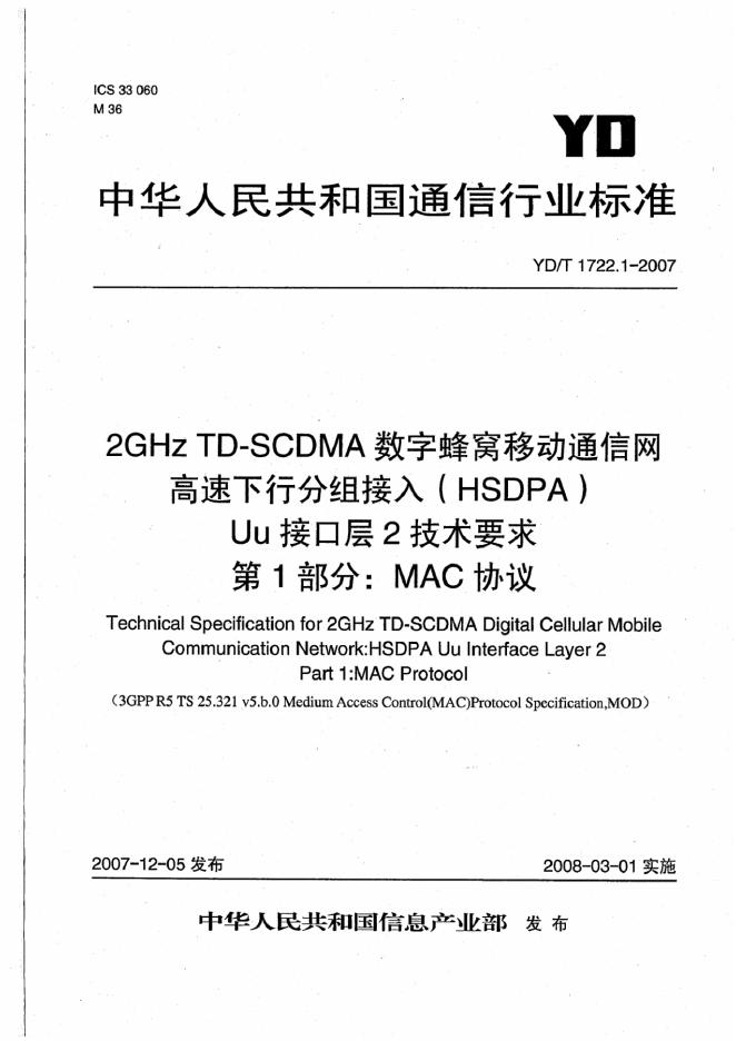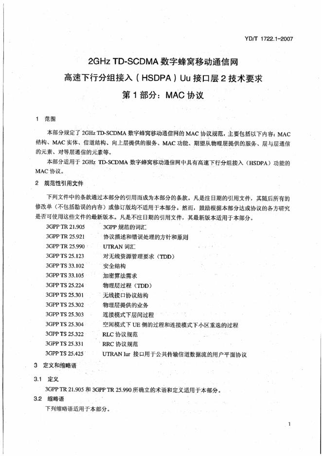 YD/T 1722.1-2007 2GHz TD-SCDMA数字蜂窝移动通信网 高速下行分组接入(HSDPA)Uu接口层2技术要求 第1部分:MAC协议