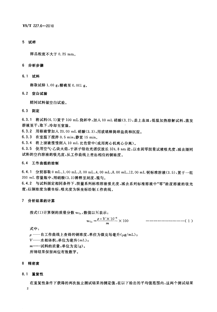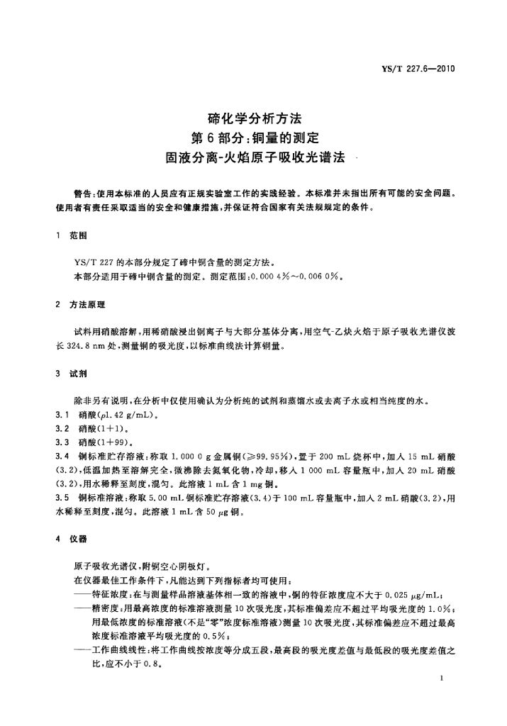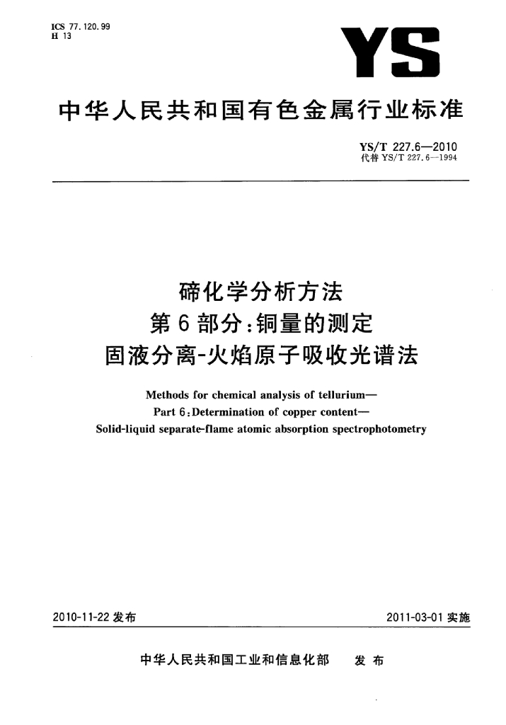 YS/T 227.6-2010 碲化学分析方法 第6部分:铜量的测定固液分离-火焰原子吸收光谱法