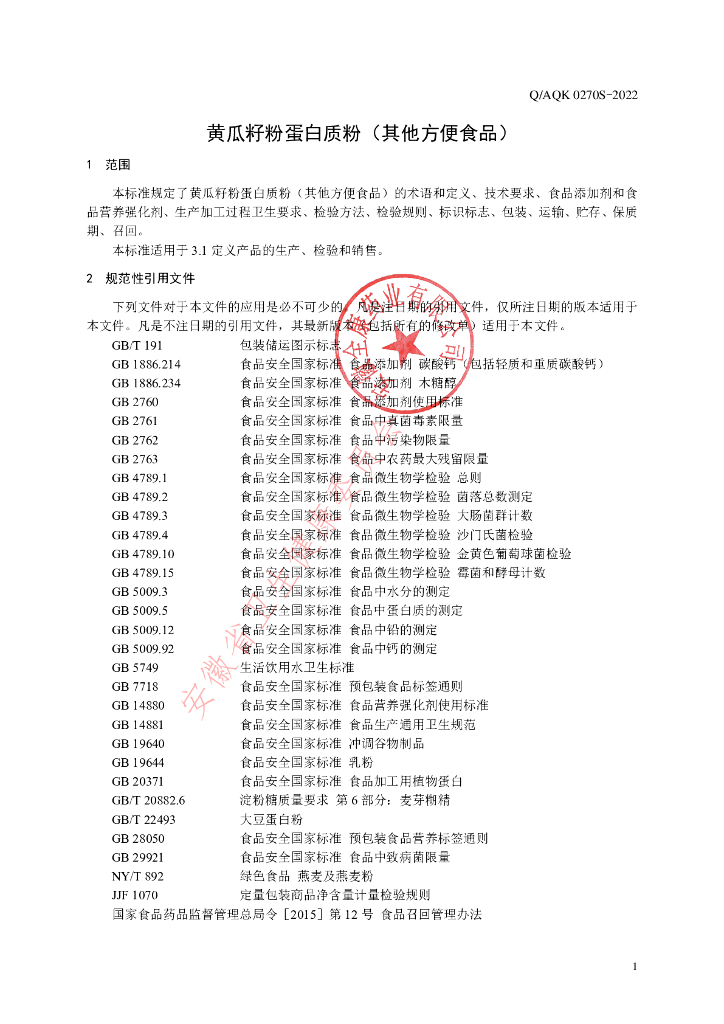 Q/AQK 0270S-2022 黄瓜籽粉蛋白质粉(其他方便食品)