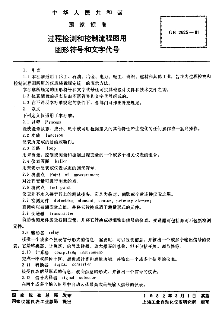 GB/T 2625-1981 过程检测和控制流程图用图形符号和文字代号