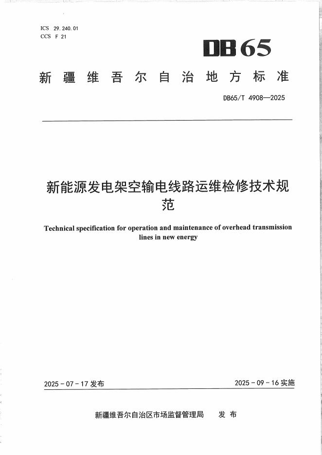 DB65/T 4908-2025 新能源发电架空输电线路运维检修技术规范