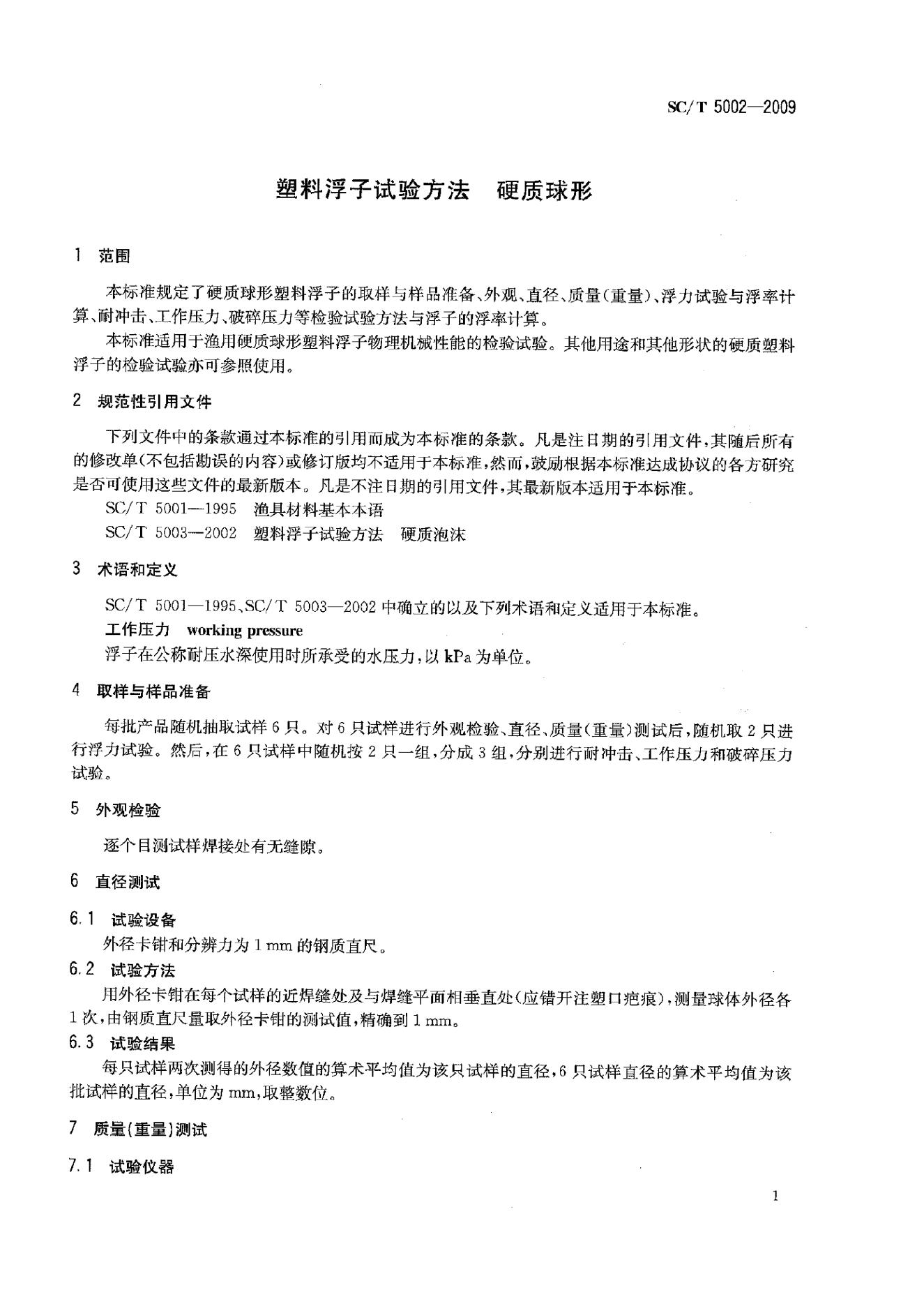 SC/T 5002-2009 塑料浮子试验方法 硬质球形