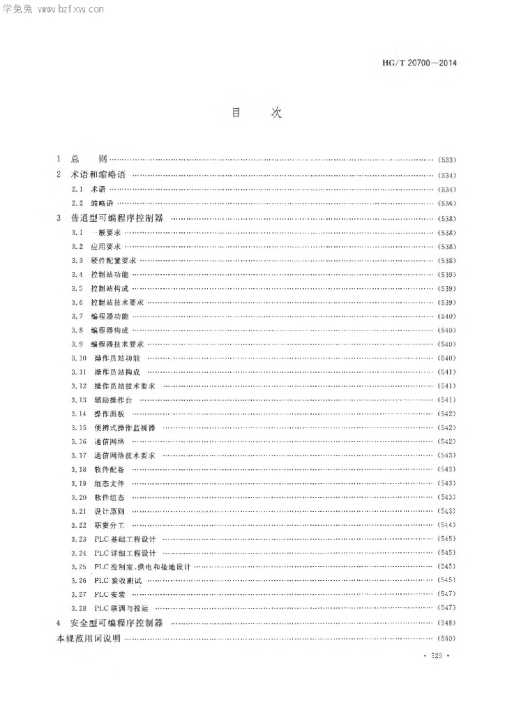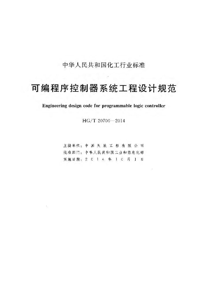 HG/T 20700-2014 可编程序控制器系统工程设计规范