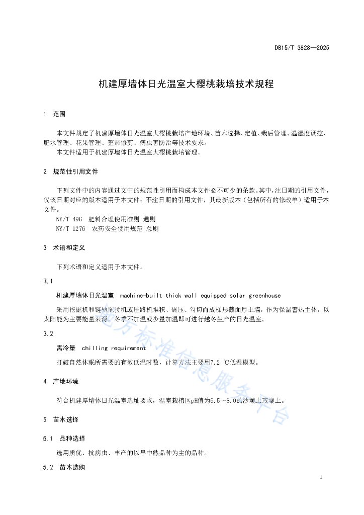 DB15/T 3828-2025 机建厚墙体日光温室大樱桃栽培技术规程