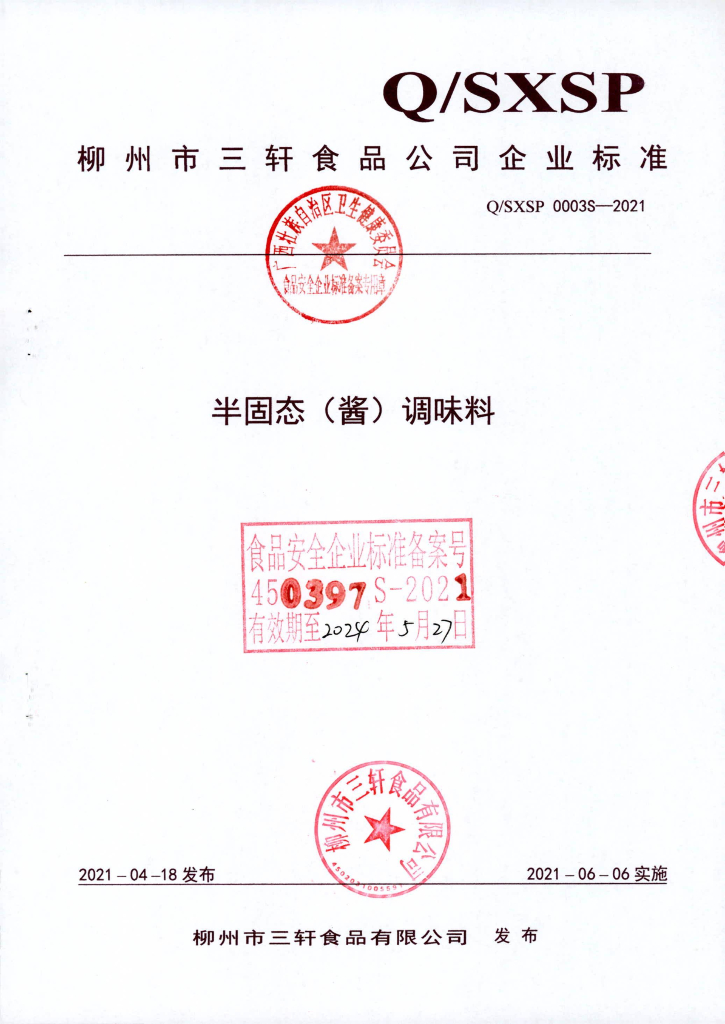 Q/SXSP 0003S-2021 半固态(酱)调味料