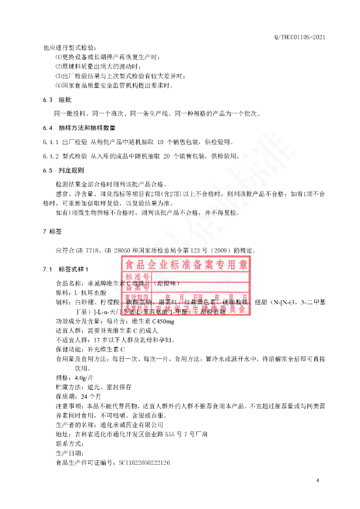 Q/THCC 0110S-2021 保健食品 承诚牌维生素C泡腾片(甜橙味)