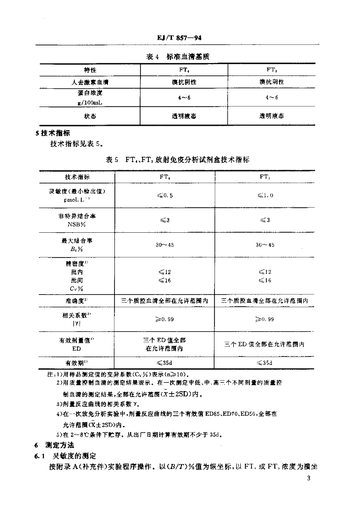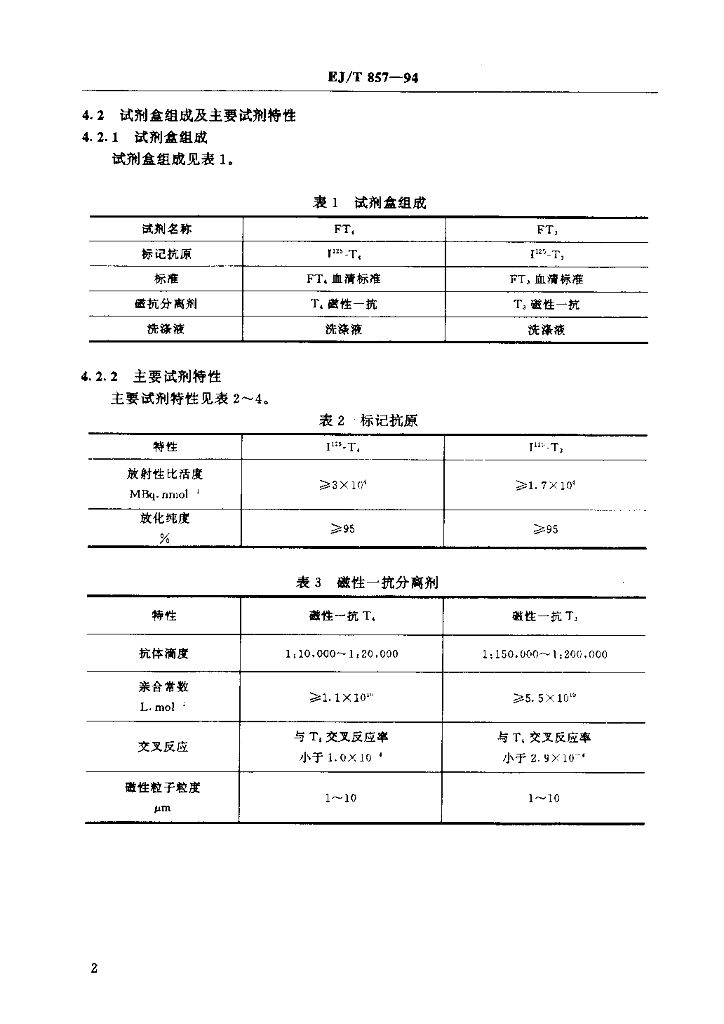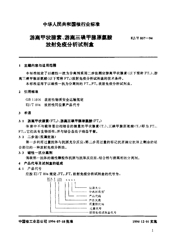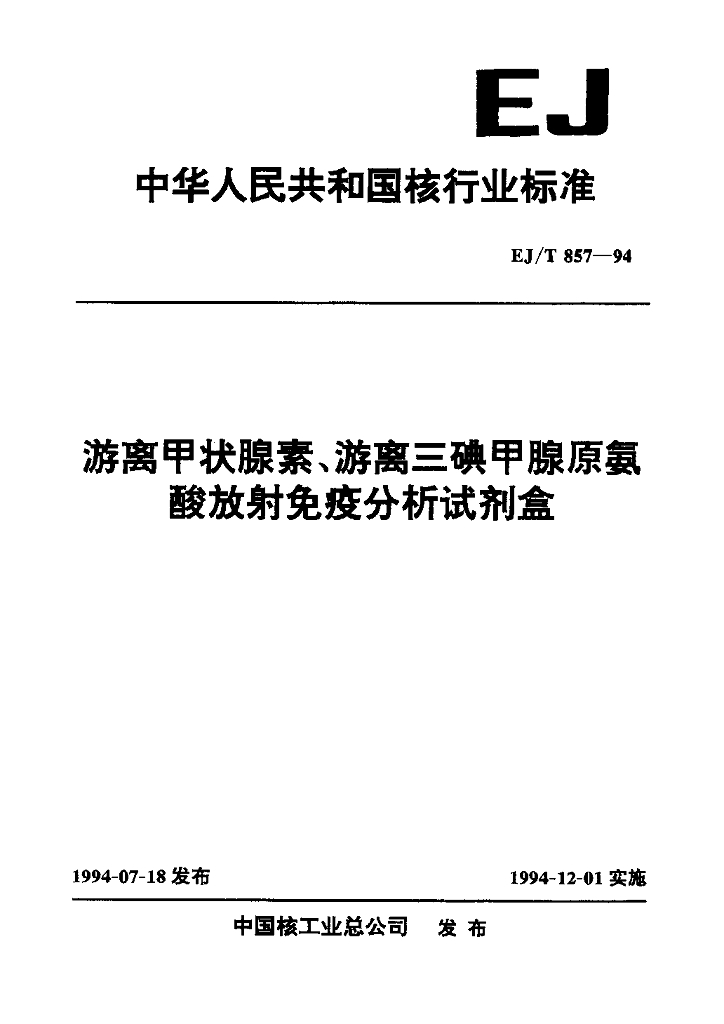 EJ/T 857-1994 游离甲状腺素、游离三磺甲腺原氨酸放射免疫分析试剂盒