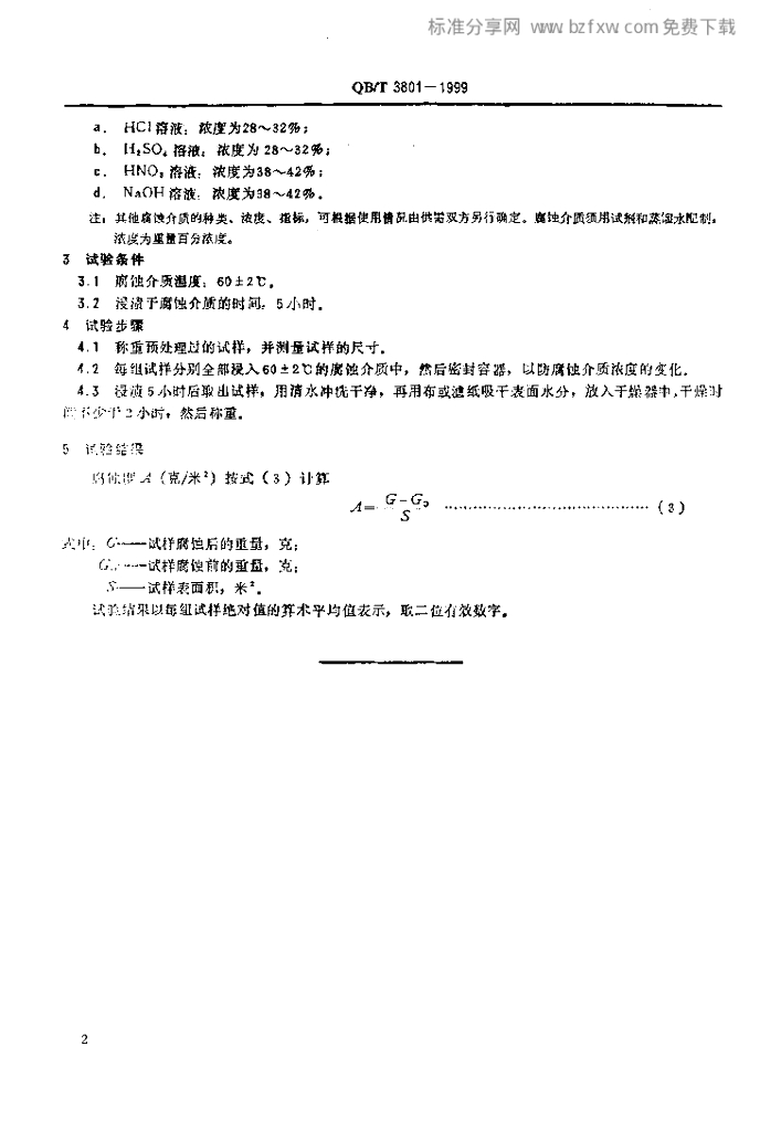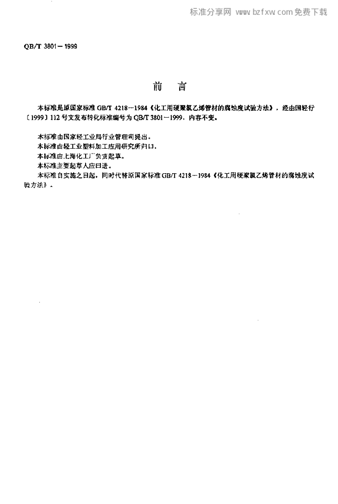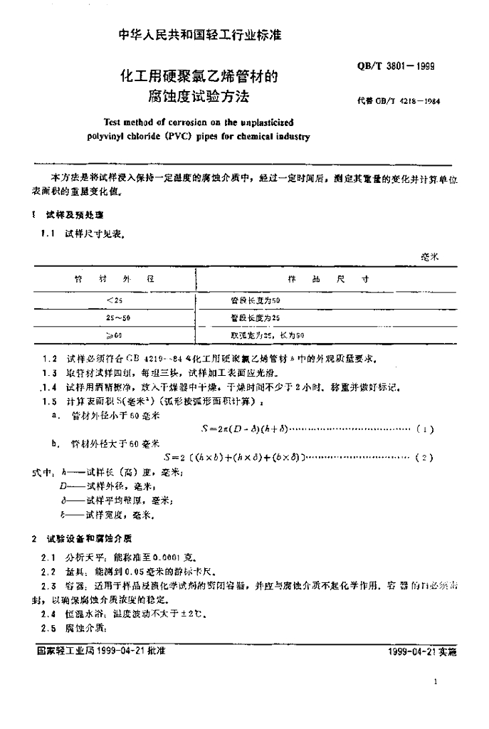 QB/T 3801-1999 化工用硬聚氯乙烯管材的腐蚀度试验方法