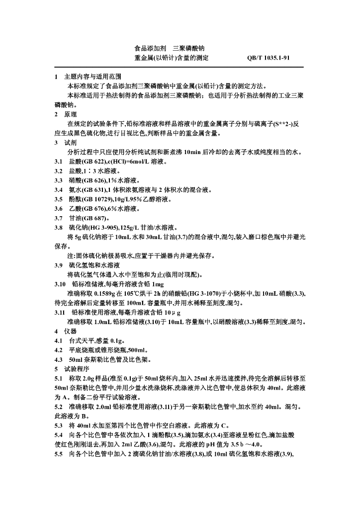 QB/T 1035.1-1991 食品添加剂三聚磷酸钠金属(以铅计)含的测定