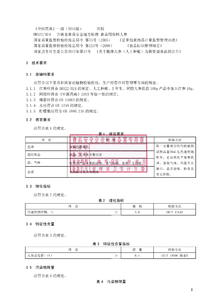 Q/JLHZ 0012S-2016 吉林韩正人参有限公司 阿胶人参饮品