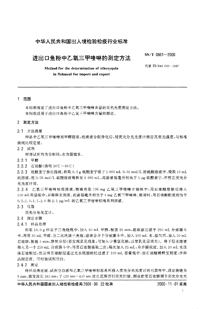 SN/T 0861-2000 进出口鱼粉中乙氧三甲喹啉的测定方法