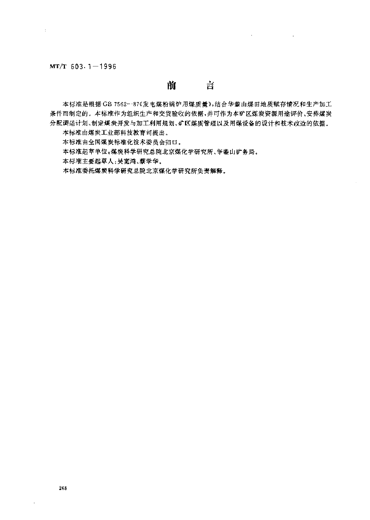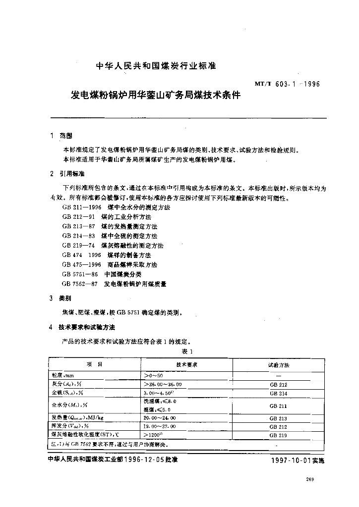MT/T 603.1-1996 发电煤粉锅炉用华英山矿务局煤技术条件