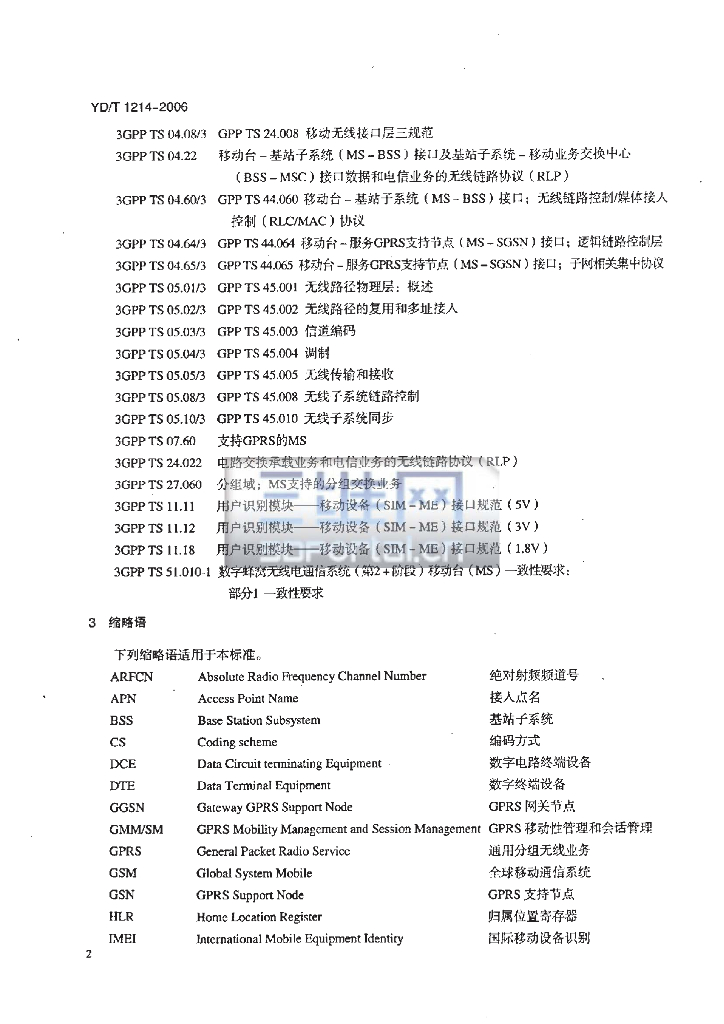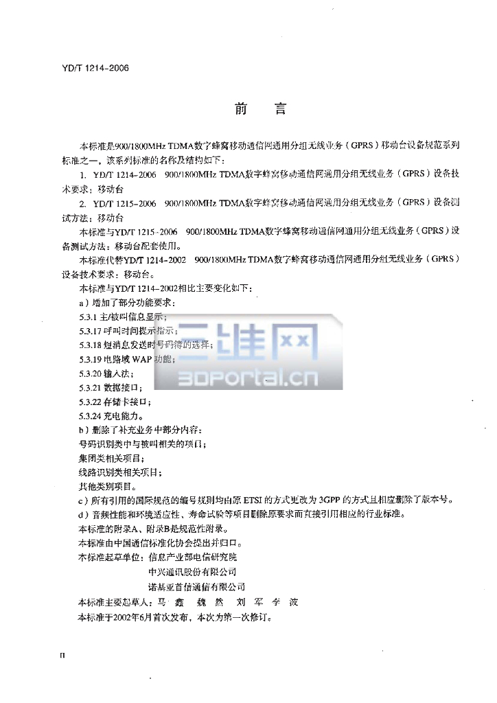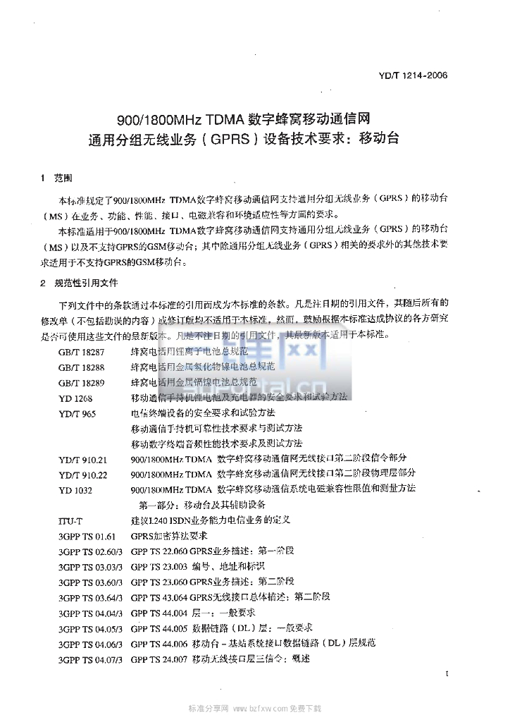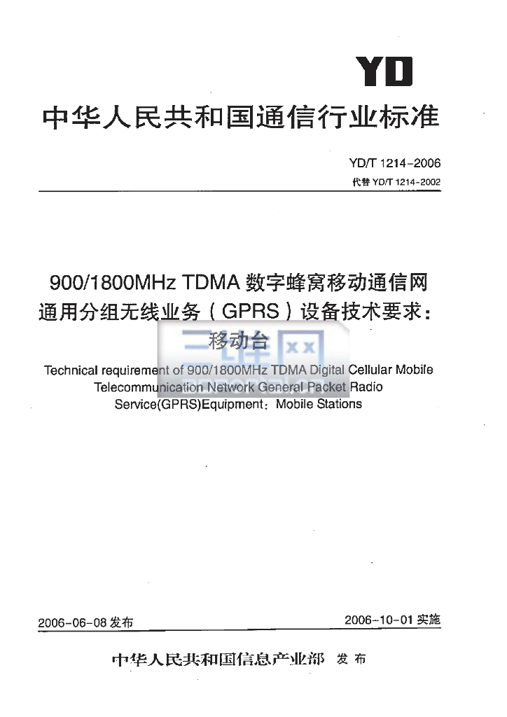 YD/T 1214-2006 900/1800MHz TDMA 数字蜂窝移动通信网通用分组无线业务(GPRS)设备技术要求:移动台